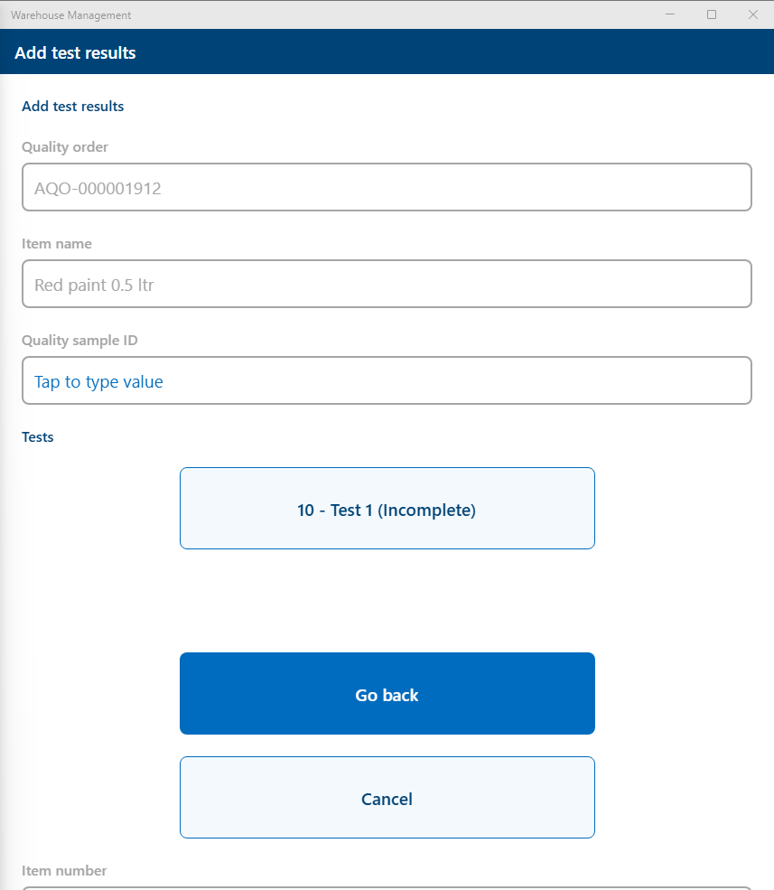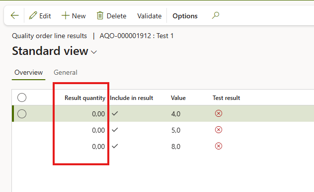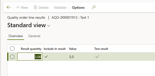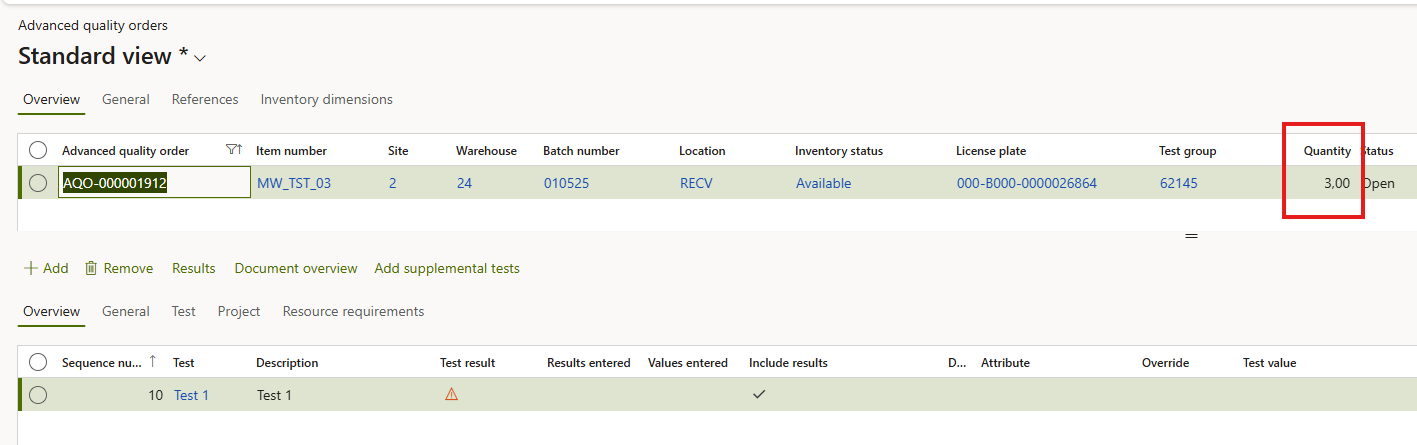 For example, register a test result for an advanced quality order where the sample size is 3 units, as shown below: