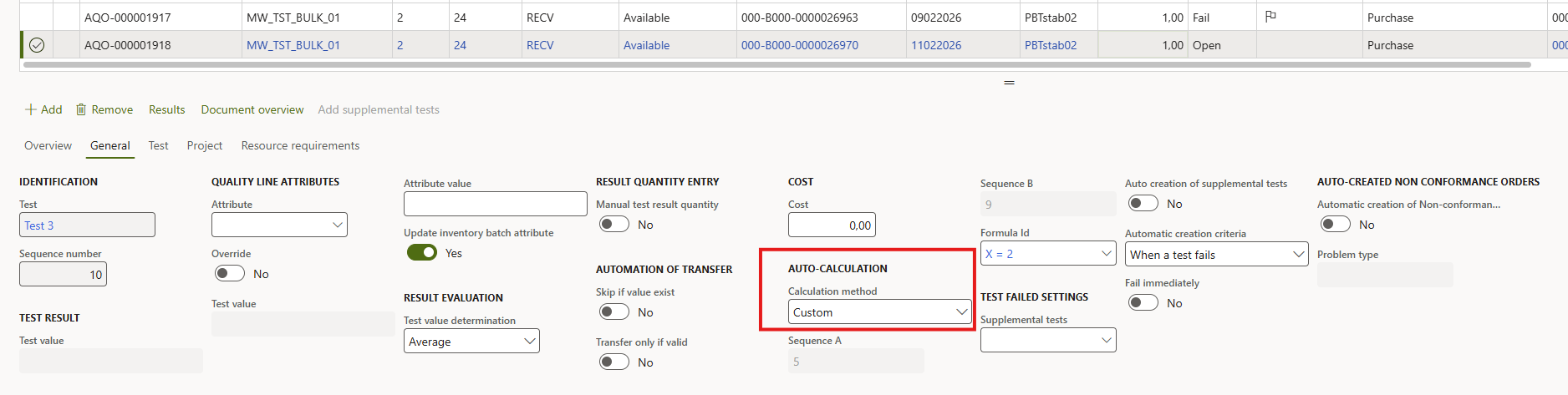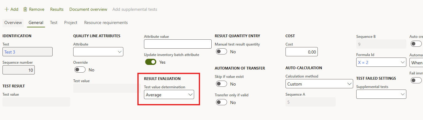 The Calculation method defines how the system automatically derives the result of a given quality test based on the values of two related tests: Test A and Test B.