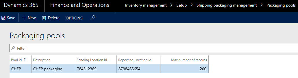 When setting up the packaging pools, information needed in the reporting file is assigned to the pool-Id. The setup is available at [Inventory management > Setup > Shipping packaging management > Packaging pools]