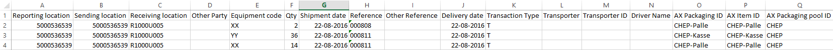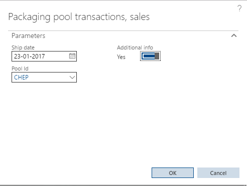 Max number of records | Max number of transaction records accepted in one file by the pool owner. If more transactions must be reported, D365FO will create more files for the date chosen.Exporting dataAn entity for reporting of pool transactions using power platform is available if reporting is not wanted by the build in export tool. This entity does support setup of Dataverse and Flow. See section 6 for an overview of available entities.From [Inventory management / Periodic / Shipping packaging / Packaging pool transactions, sales] a dialog can be opened to setup criteria for generation of the "CSV" file that then can be edited directly or saved were you choose to: ![]() |