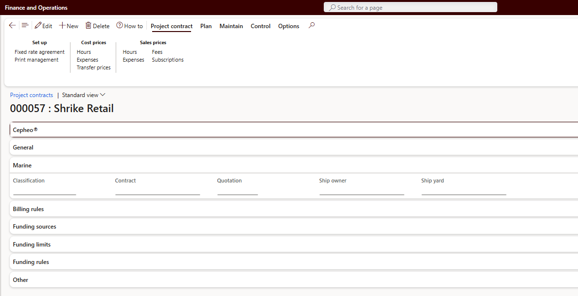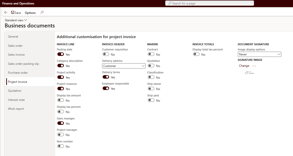 Navigate to Cepheo® > Business Documents > Setup > Document setup in the Modules menu. This setup extends the generic options and provides additional setup only enhancing the Project invoice detailed design.