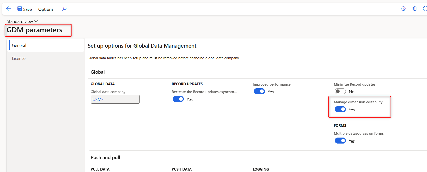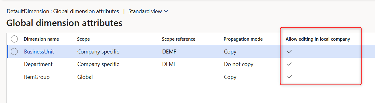 On top of the Propagation mode setup, each financial dimension can be locked or enabled for edit in the local company. This requires the following configuration turned on in GDM main parameters:
