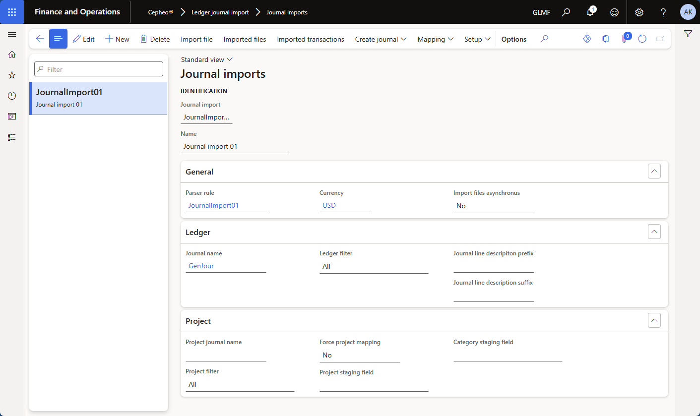 Navigate to Cepheo® > Ledger import > Journal imports in the Modules menu.