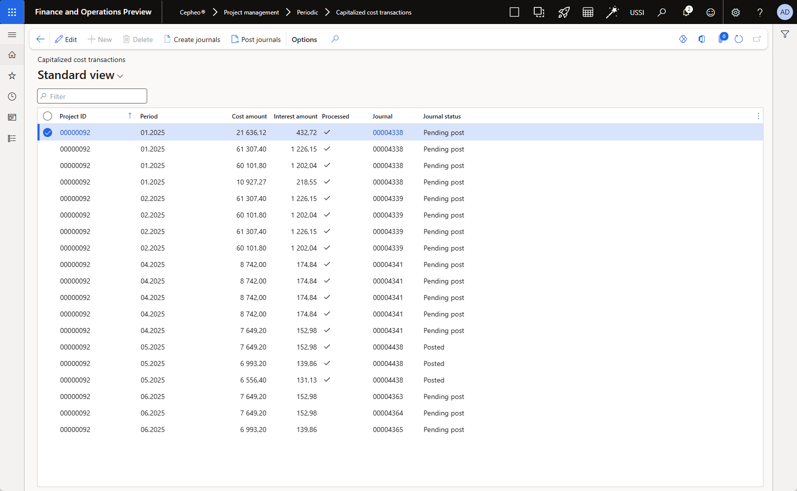 All generated journals are also visible in the Project Journal form for the respective project, allowing you to review and manage them in the standard project journal workspace.