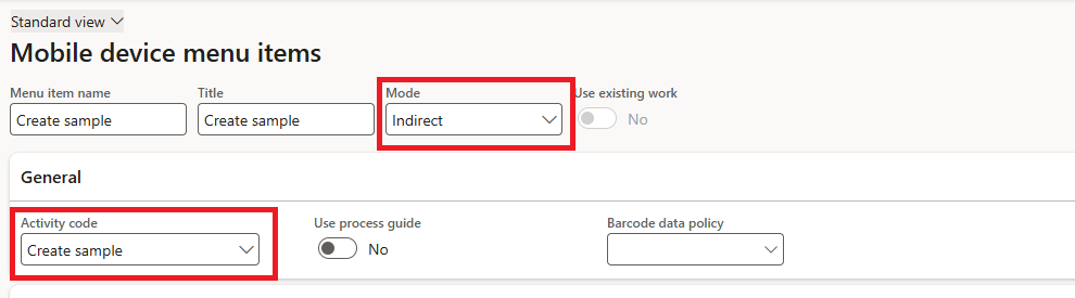 This function is accessed via a mobile device menu item (Warehouse management > Setup > Mobile device > Mobile device menu item) configured with the activity code Create sample type in Indirect mode, as shown in the below figure: