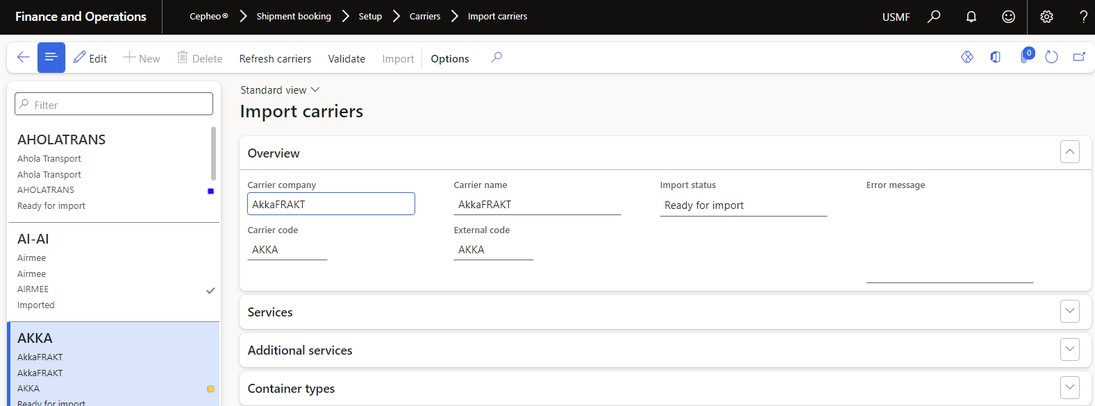 - Resolve all errors found on Carrier, Services, Additional services and/or Container types