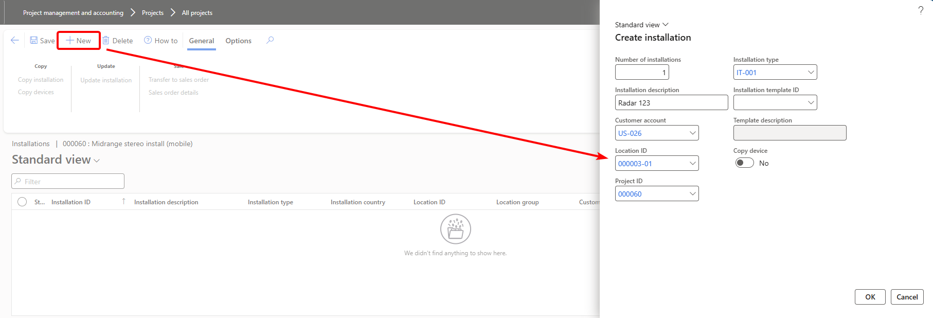 Information from the Project are predefined - select Number of Installations, Location and give the Installations(s) a name and select "OK" to create a new Installations. Remember to rename if more than one Installation is created.