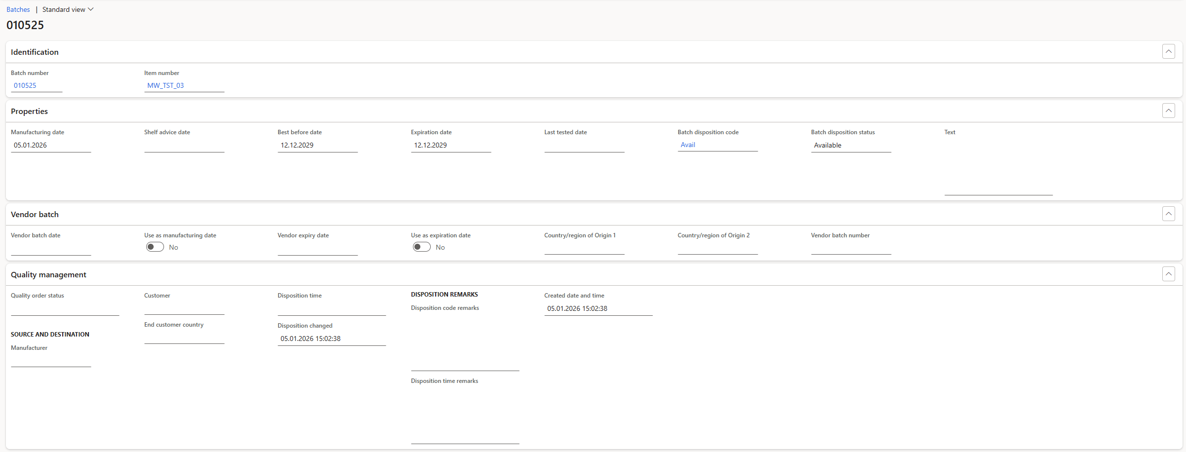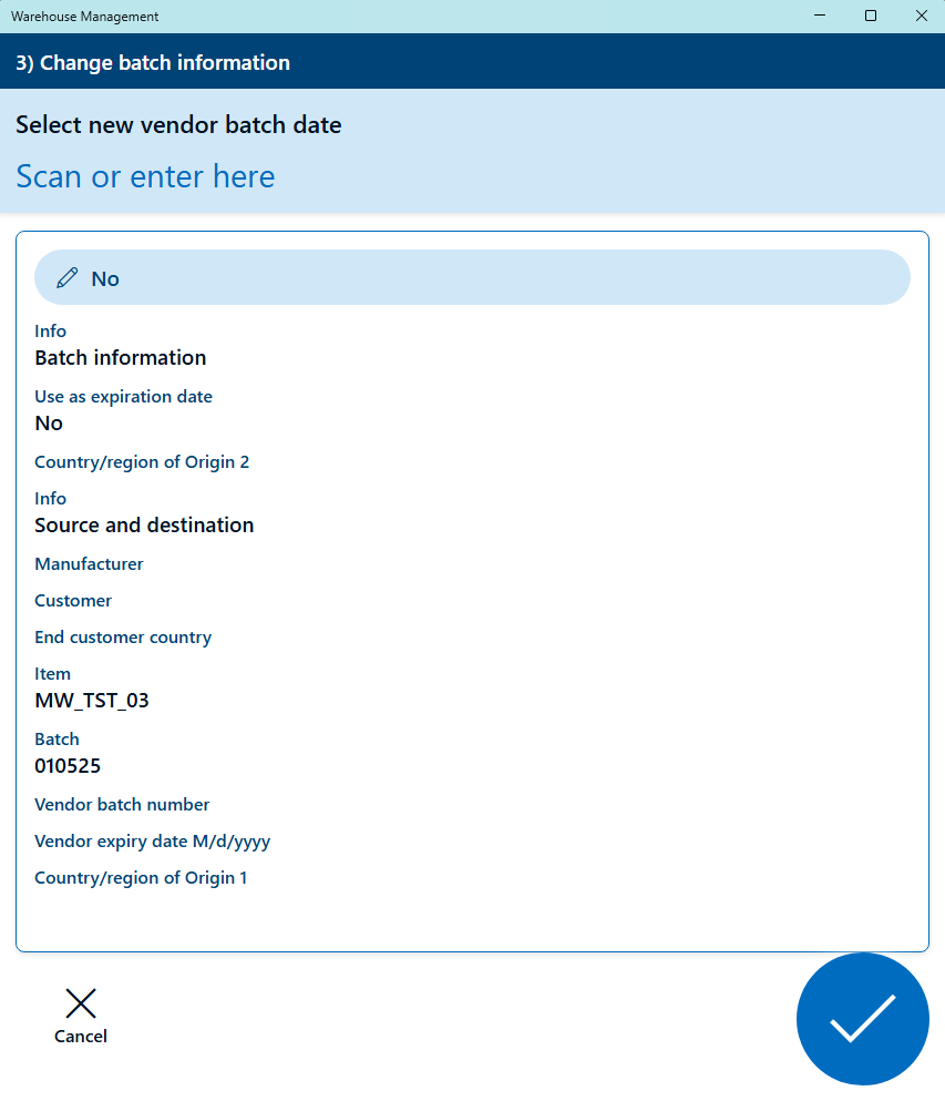 After selecting this menu item in the mobile app, the user must enter (scan) the item number and batch number. Then the system displays a form where the worker can change information for the selected batch, as shown below: