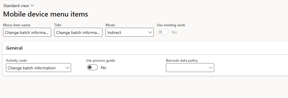 For this purpose, the Change batch information activity code has been introduced for use in mobile device menu setup.
