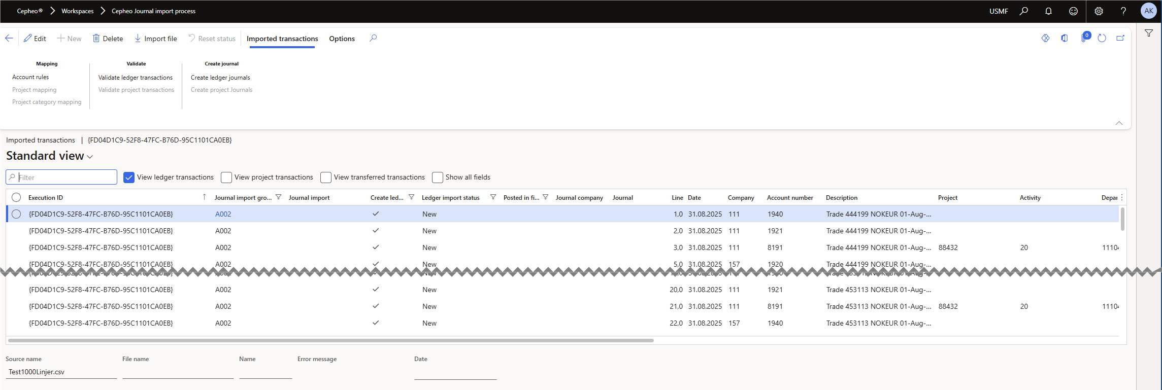 Navigate to Cepheo® > Ledger journal import > Imported files, select the required Imported file, and open Imported transactions.