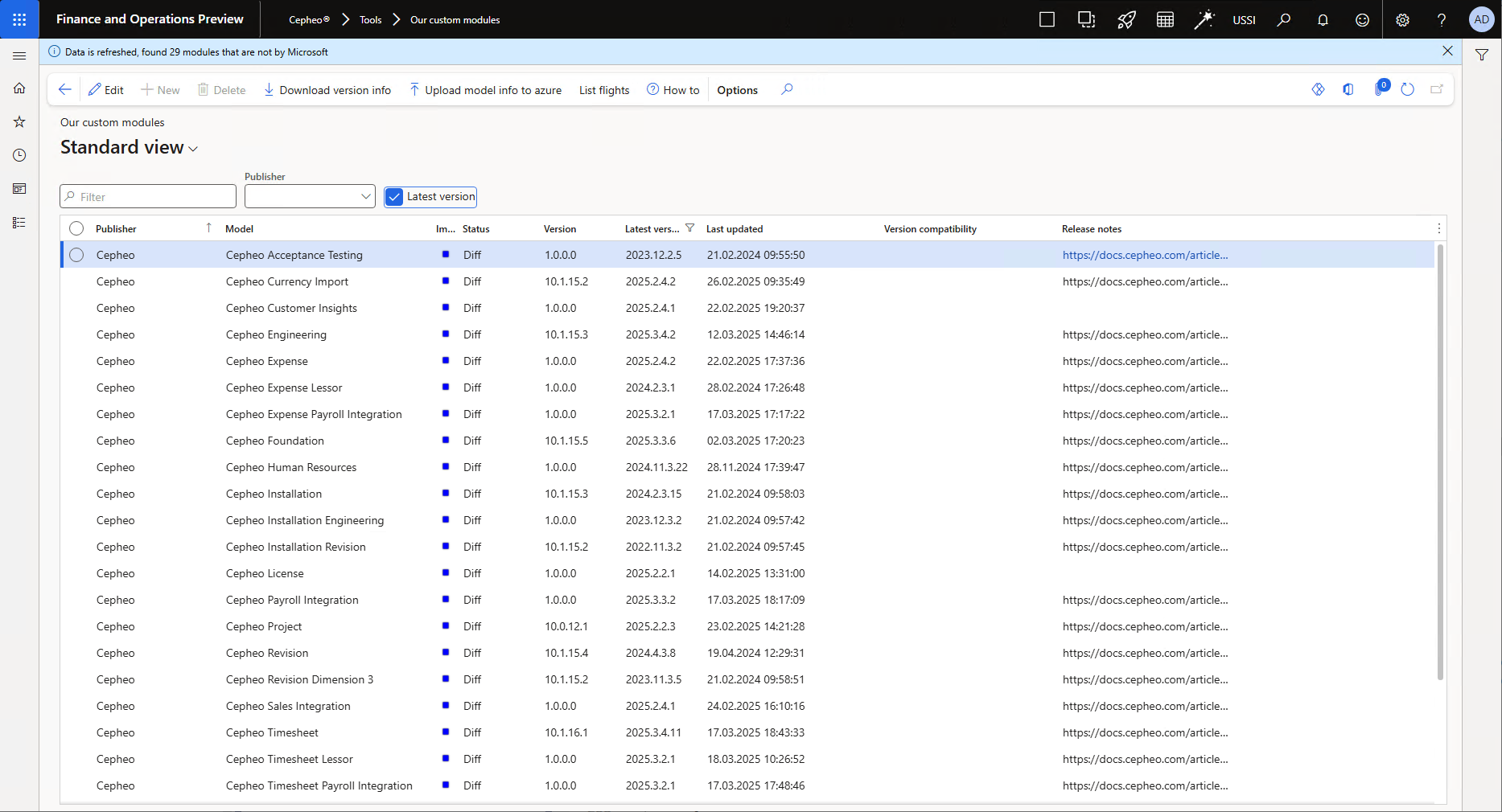 When the form is opened there will be a check against azure to check for the latest version published, making it very easy to compare what you have in your environment against the latest releases. A link to release notes is also included, so then you can go directly from FO to the release notes here on docs.