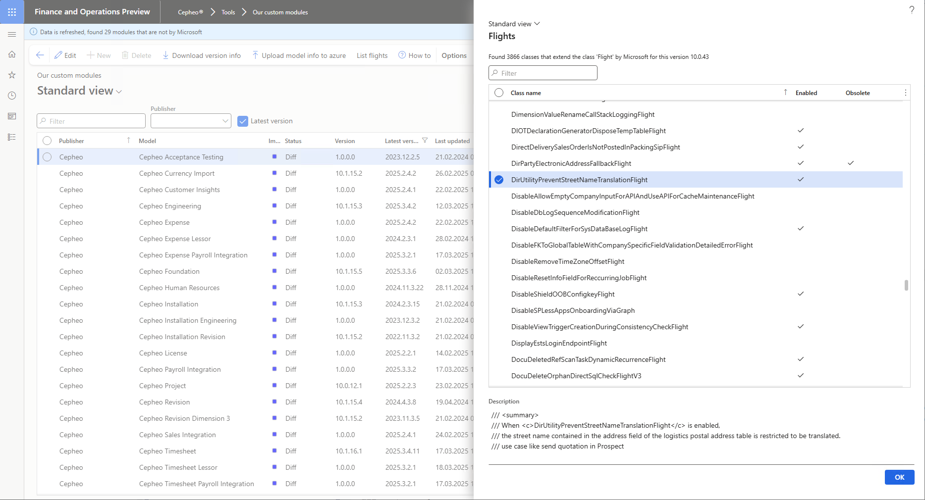 There is also a function here to list all the flights used by MS, this are all the internal flights that can be deactivated, for production environments a case must be created for MS to fix this, on UAT/STAGE/DEV boxes you can do it yourself. The list is searchable and you can see the status.