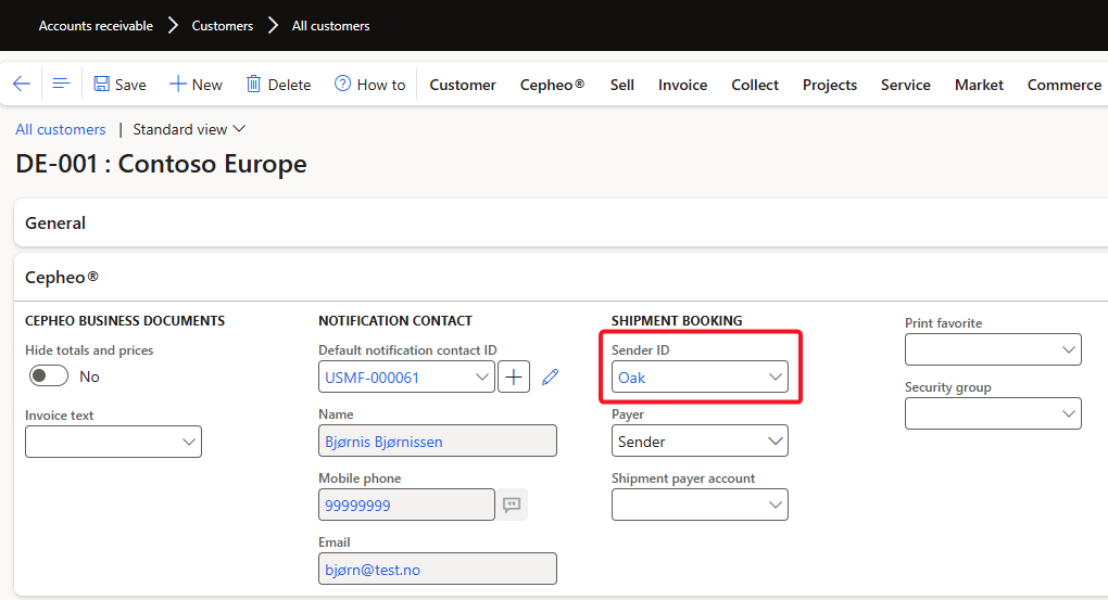 The default sender ID can be set in the field "Sender ID". The field can be found by navigation to Cepheo (fast tab) > Shipment booking (group)