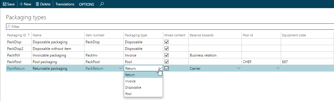 - "Return" is for packaging that is expected to be returned to us. For this type we track the handling inventory-wise, and whenever its content is sold, we transfer this to a 'custom' site and warehouse setup on the customer/vendor/carrier behind the scenes. The current on-hand of the packaging material in different sites and warehouses, can be seen from the packaging ID i.e., the item number linked to the type. This type can be balanced against the Business relation i.e., Customer or Vendor as well as the Carrier moving the packaging.