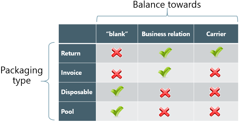 The allowed combination of "Packaging type" and "Balance towards", can be seen below.