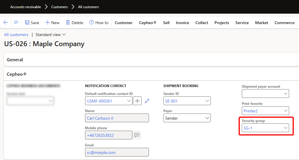 If the security group should be default on the customer, proceed to the customer card and add the group on the fast tab Cepheo®.
