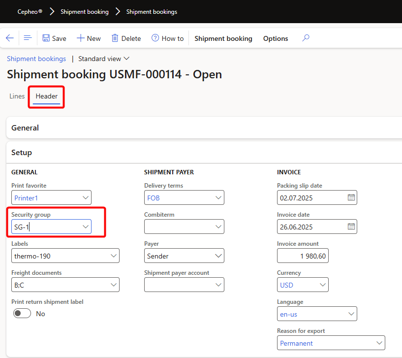 If the security group should be added manually onto the shipment booking, set the choice in the fast tab Setup.