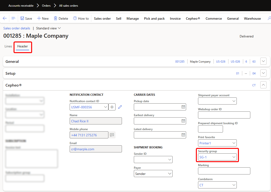 If the security group should be added manually onto the sales order, set the choice in the fast tab Cepheo®.